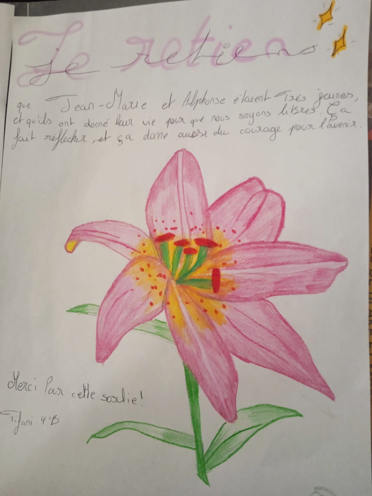 Je retiens que Jean-Marie et Alphonse étaient très jeunes, et qu'ils ont donné leur vie pour que nous soyons libres Ca fait réfléchir et ça donne aussi du courage pour l'avenir.Merci pour cette sortie !" TIFANI